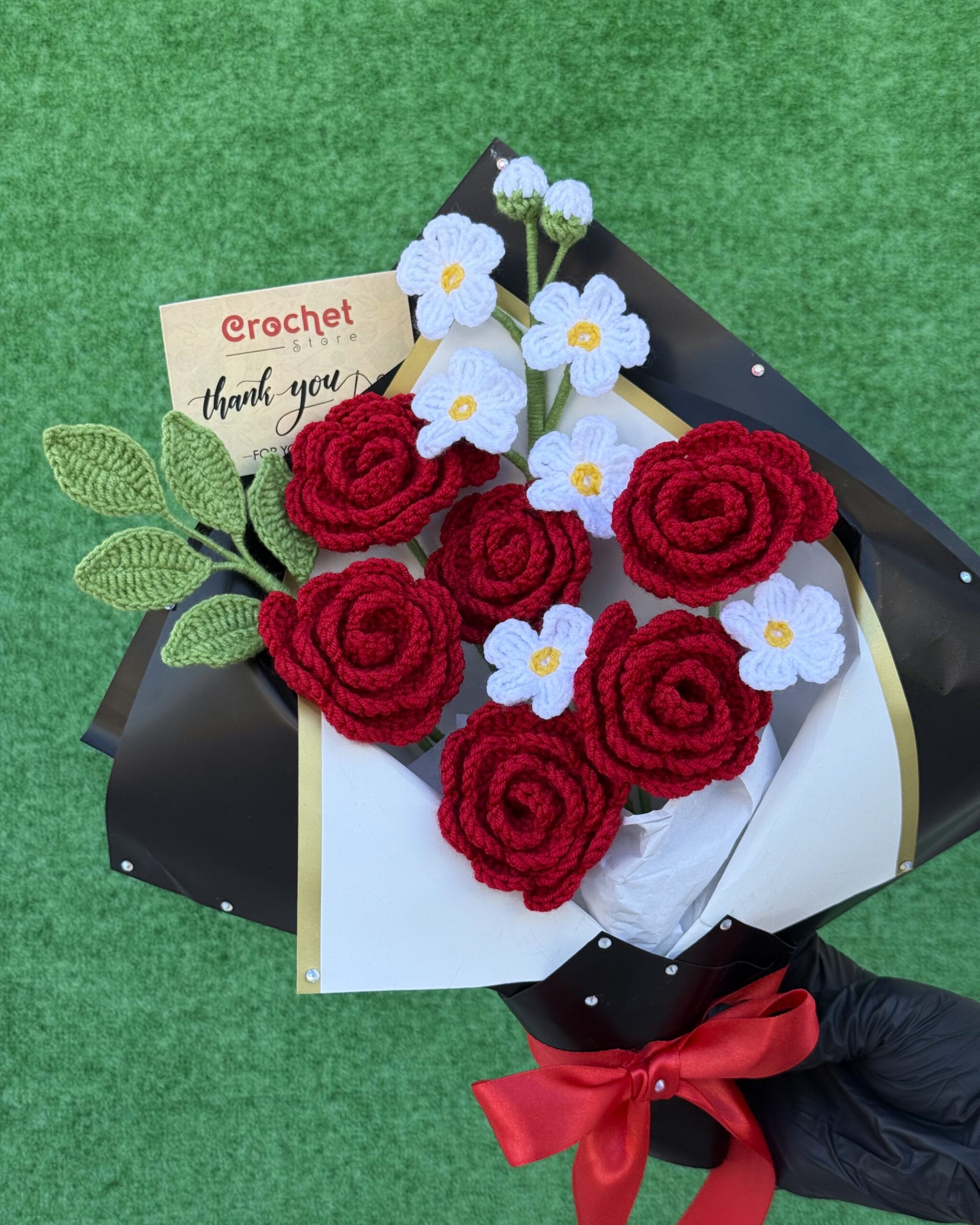 This crochet flower bouquet is a beautiful handmade arrangement that never wilts. It includes 6 red roses, 6 mini daisies with green leaves, all carefully crafted to add charm and warmth to any space.