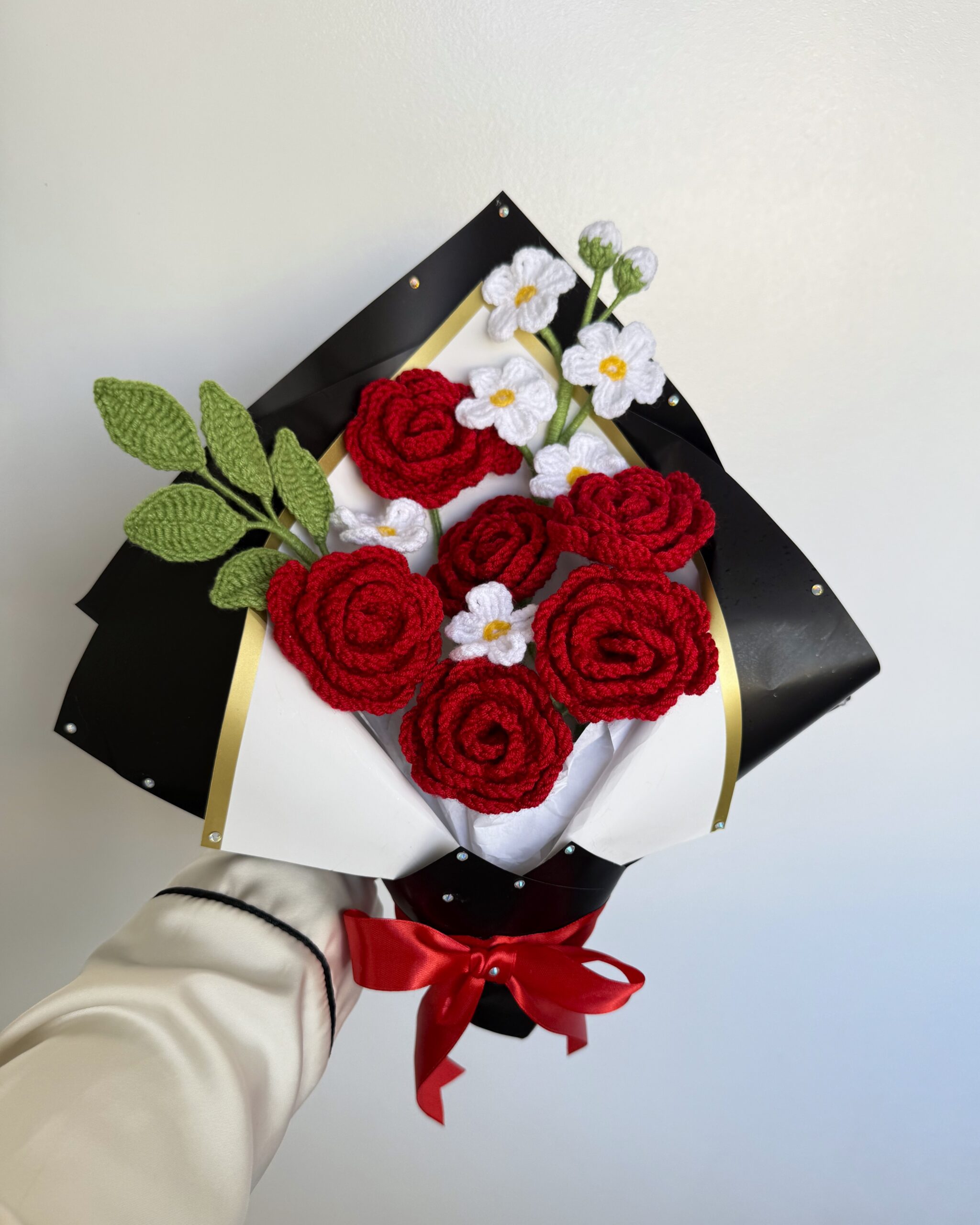 Handmade crochet bouquet featuring 6 red roses, 6 mini daisies with lush green leaves – a unique, everlasting gift for any occasion.